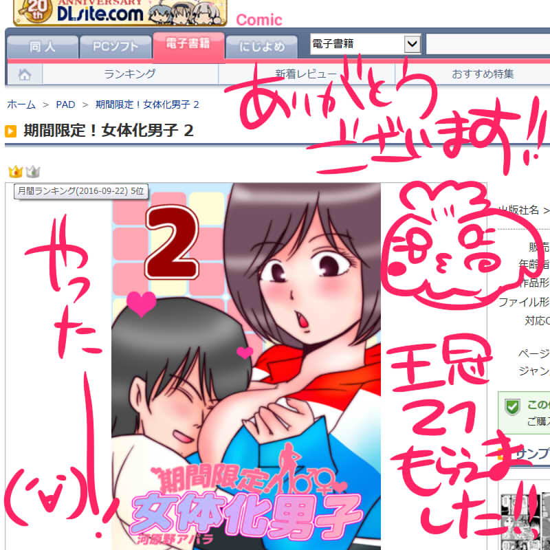 DLSitecom様で電子書籍ランキング上位入りありがとうございます!2話配信とともに1話も上がってくれて大変嬉しく思ってます。ぶっちゃけJUNANが1巻で挫折される方多数だったのでシリーズを続けて買ってくださる方がいらっしゃる事実に感謝し通しですつД`)・゚・。・゚゚・*:.。..。.:*・゚
