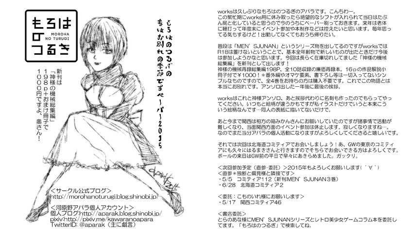 3/8 the woRks original 29 http://blog.livedoor.jp/overdose_co2/ で出す新刊は 3月新刊:神様の機械総集編(198p)+16pオマケ作品解説本(¥1000)と告知しましたが なんかすげえのが届きました。分厚い!たぶん長い同人人生で一番分厚い本です。これだけ厚いと背表紙がカッコいいですね!単行本みたい~( ´∀`)一緒に写ってるのはオマケ本です。ちょっとしか刷ってないのに箱が激重でした…。これworksに手搬入とか…気も重くなってきました★