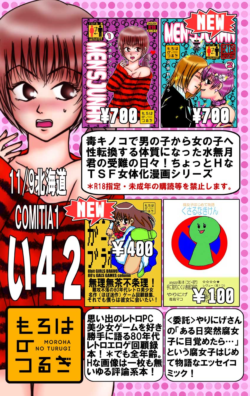 北海道コミティア1ありがとうございました! イベント活動 2014年11月10日 昨日の北海道コミティア1が盛況のうち無事終了しました!スペースに来ていただいた皆様・お知り合いの方々本当にありがとうございました!あんなにたくさんのサークルさんと一般の方々が参加するイベントが地元で開催されるとは…長生きするものです。ティアマガも完売したそうで本当に大盛況なイベントでした。次回も必ず参加します!当日のスペースはこんな感じで独断と偏見のはるまきさんと隣接合同会計で参加しました。電卓あるのに会計遅くてマジすいません…(毎回です)二人で交代で売り子したおかげで二人揃ってHPもMPもゴールドもゼロになるほど買い物できました!いやっほう!(そしてHPなさ過ぎてちょっと食べて即帰還)(前夜祭ではっちゃけすぎました)思った以上に新刊のレトロ美少女ゲーム本が老若男女(ホントに)の方々に興味をもって頂いて 持込というか手元分は完売しました!ありがとうございました。最後は見本誌すら販売するくらいに…みんな80年代大好きだな!エロゲ好きだな!いやホント漫画描きがコラム本作ると言う無謀な本でしたがお楽しみ頂けると幸いです。「8bitガールズブラボー」は手持ち分の在庫は完売しましたので現在はとらのあな様でのみの在庫となります。イベントに反して書店はサッパリ売れてませんので(笑顔で)通販のご利用を是非!MEN'SJUNANも2巻が書店分と、イベント分は11/23コミティア110での独断と偏見さんへの委託分(残少)になりました。2が手にとってもらえたということは1のリピーターさんが来てくださったことだと思ってます。こちらもありがとうございました!1巻は再販したのもあってまだ若干ありますにょた。北ティア応援アンソロ「ポラリス」にも久々にもろはのつるぎとして二人揃って参加しました。箱みかんさんの新作が読めるのはポラリスだけ!私は2p地味地味な漫画描きました。最初は「初めての女装お散歩」とか描こうとしてたんですが本気で止めてよかったです。あ、タイトルの元ネタはくるりのばらの花からです。*当日配ったペーパーはこちら。色々開催への思いはこっちに綴ってます。「神様の機械の再録は…」と言う声もちらほら頂きましたので頑張りたいと思います…早くて3月worksあたりを目処に…ゴニョゴニョ…ツイッターで「誕生日間近ープレゼントくれー」と大人気なくつぶやいていたら本当にプレゼントもいただけてうれしはずかしありがとうでした!他にも差し入れなどもありがとうございます。いつもTSFっ子二人で(´~`)モグモグ頂いてます。地元でかつてないとても大規模でとても楽しい創作イベントでしたので末永く継続されるようお祈りしております。主催様、スタッフの皆様お疲れさまでした、そしてありがとうございました!!余談:前夜祭ははっちゃけすぎました。若い男女にセクハラする簡単なお仕事をしてました。酒の勢いで東京コミティアの中村代表に握手していただきました★だって遠征してもなかなかあえませんよ?ちなみに次の日に中村代表にスペースでもお話させていただいた上に本を買っていただいて、ビックリして椅子から転げ落ちたサークルはこちらになります。人間リアルに腰が抜けるって初めて知りました。今年の直参はこれが最後ですが皆様来年もよろしくね!春まではゆるゆるしてます。頭が。junanの3巻は5月の関西コミティアが初売りの予定。暇なうちに40pくらいは下書きしてるので出るかと。アパラ、来月休みないってよ。(某小説風に) [0回]