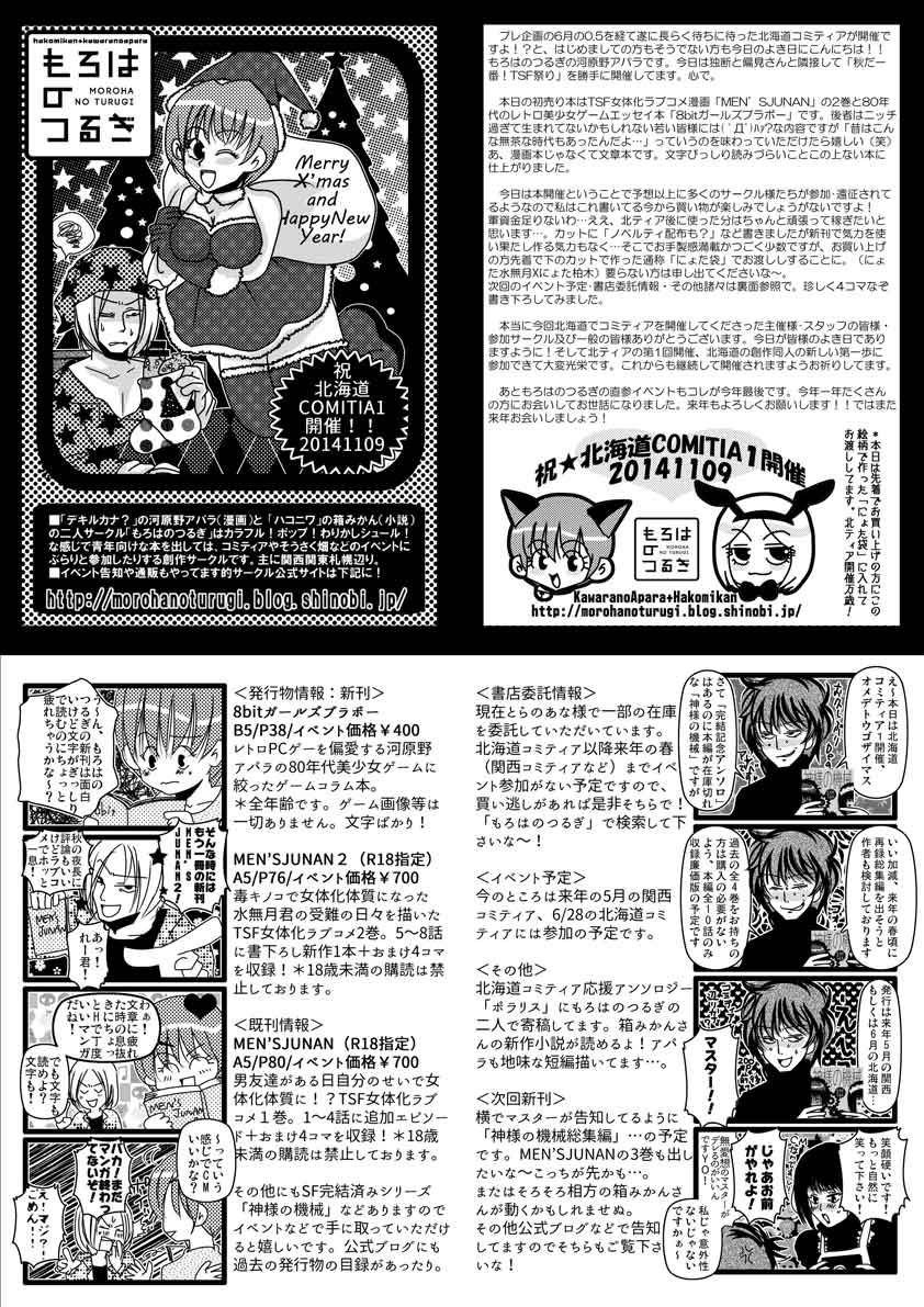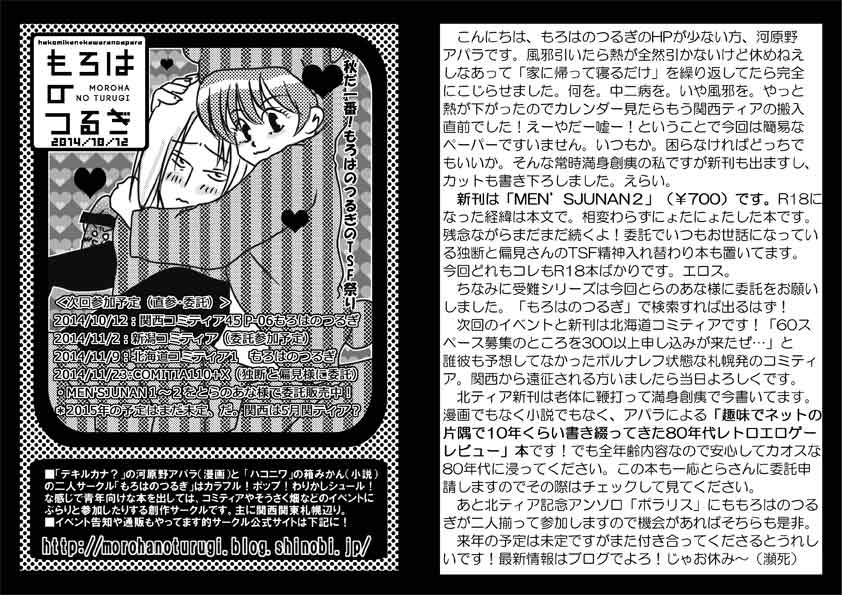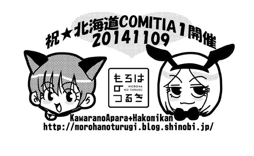 新潟・北海道コミティア+COMITIA110(委託)スペース情報 新刊情報 2014年10月17日 北海道コミティアその他コミティアのスペースが出たのでお品書きとともに告知でーす。<秋だ一番!TSF祭り2014>2014/11/2:新潟コミティア 委託NO.3 もろはのつるぎ(MEN'SJUNANとヒロヒロ委託)2014/11/9:北海道コミティア1 もろはのつるぎ い42(直接参加、お品書き参照)2014/11/23:COMITIA110+X(お47a:独断と偏見様に委託)(MEN'SJUNANシリーズ委託予定)<北海道コミティア当日について>当日の新刊はMEN'SJUNANの2巻初売りと誰得レトロ美少女ゲーム読本です。<p><a href="http://www.pixiv.net/member_illust.php?mode=medium&illust_id=46348366" target="_blank">【委託開始】80年代美少女ゲーム回顧録本サンプル</a> by <a href="http://www.pixiv.net/member.php?id=3020591" target="_blank">アパラ@北海道コミティアい42</a> on <a href="http://www.pixiv.net/" target="_blank">pixiv</a></p>当日は「独断と偏見」さんと隣接で、売り子も交代でする予定で、2スペを一人で応対してる場合があります。アパラかはるまきさんのどちらかがスペースにいれば2サークルの本は購入できますので何卒よろしくです。合同スペースみたいに考えてくださればよいかと。数少ないですが、本をお買い上げの方には下の絵柄の袋に入れてお渡しします。ペーパーも4コマとか書いてます。当日遊びに来てね!私自身も地元・遠征サークルさん共にたくさんのサークルさんが参加されるので買い物がめちゃくちゃ楽しみです!!軍資金いくらにすればいいのかしら(残高に尋ねながら)(しかし無言)北ティアが今年最後の直参なので是非お立ち寄りください。あと新刊共々書店委託やってます。イベントで買い逃した、イベントにいけない方はこちらをご利用ください。受難1~2も一時完売中です。ありがとうございます。*追加納品済みなので後日また再開します。 河原野アパラでした。じゃまた、北ティア後のレポでも。 [0回]