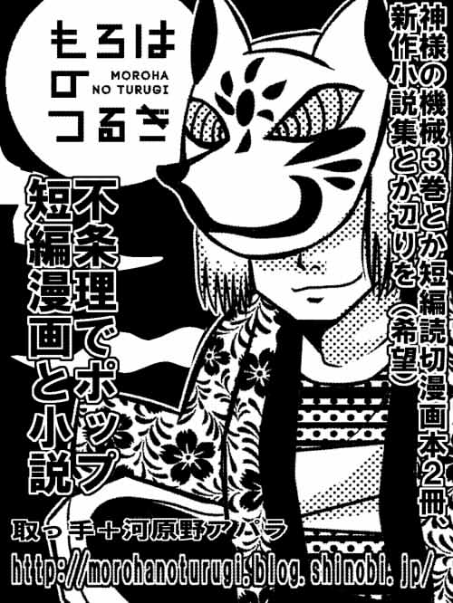 秋のイベント参加予定+関西ティアスペース告知 イベント活動 2012年09月13日 もろはのつるぎの風呂が壊れてない方、アパラです。またお前の日記かよ!とか禁句。コミティア101、お疲れ様でした。新刊手にとって下さった方ありがとうございます!とりあえずサークル一年?くらいやって今のところ売り上げゼロの記録がないのでそれだけでも快挙だって思ってます。自分らで。ただコミティアの委託コーナーも今回が最後ということで次回のティア参加の目処が立ってません。GWの5月は出る予定ですが。で、今後のイベント予定。●次回イベント予定・2012/10/14 関西コミティア41 A-05(取っ手参加予定)・2012/10/28 Elysian22(アパラ参加予定)どちらも各々の地元で創作サークル「もろはのつるぎ」で取ってます。私本当は関西行きたかったんですが、諸事情で断念しました。早々に。なので代わりに札幌のイベントにでてみます。ちなみに関西ティアに残りの在庫送るのでエリシアンには神様シリーズは置いてません、ゴメンね。次回のイベント(そうさく畑?コミティア?)までには神様の機械1と2の再販+3巻の発行をしたいと思ってます。10月の関ティアはきっと取っ手さんが新刊出してくれるよ!きっとね!私の個人誌は10月に新刊無理!ということで関西初売りの本を2種類ほど持っていきますのでよろしくです。イベントいけない方は通販もやってますのでドゾー。カットはパン屋再襲撃の狐面こと中川です。相方のリクです。あと神様の機械の新作六話はこっちで連載中。スペースが決まったらまた告知します、相方が。 [0回]