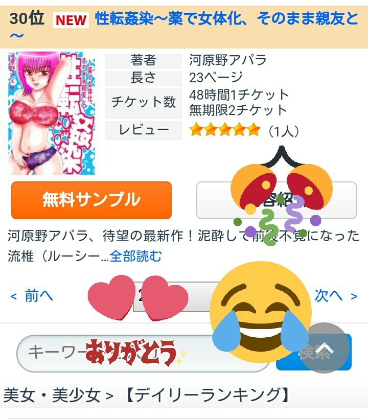 Renta!さん3/6付けデイリーランキング30位!自己過去最高記録です、本当にありがとうございます!!信じられない…。・゚・(ノД`)・゚・。発売日にレビューもいただけました!
