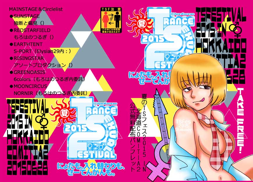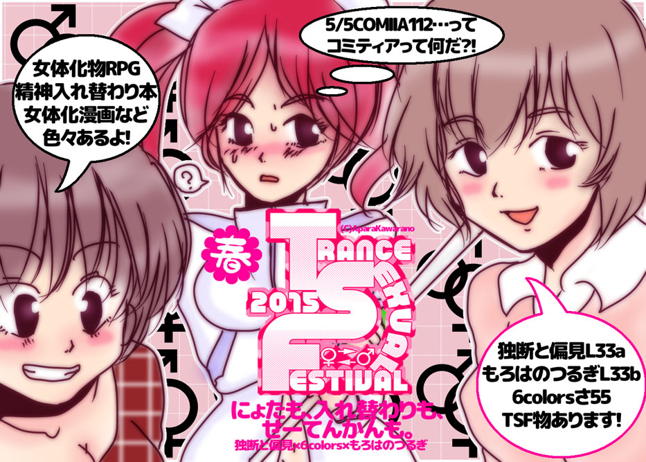TSFestival2015ログ置き場 イベント活動 2015年11月15日 <管理人が関わった企画ログを残して置きます。尚全ての企画は終了してますのでお問い合わせはご遠慮下さい。>終わったと思ったら大間違い!6colors様主催で2016年春の東京コミティア116で華麗に復活!!春のTSフェス2016開催決定!!\(^o^)/ *終了しました*今回のフェスは主催は当サークルが主催ではありません。お問い合わせ等はもろはのつるぎ宛ではなく、上記公式サイト様へお願いします。以下は過去の開催ログ↓* ここは各地コミティア非公認の自称TSF(性転換物ジャンル)スキーさん集まれ企画「TSフェス2015」の特設会場跡地です。 TSFで活動してる、またはTSモノが好物です(´~`)モグモグと美味しく頂ける紳士淑女のための企画紹介ページです。 *北海道コミティア2での有志企画版は終了いたしました。ありがとうございました!北海道コミティアの公式ブログのレポに綺麗に撮影していただいたスペースの写真が掲載されてますので当日の様子はこちらでドゾ。 【TS紳士淑女の社交場:TSフェス2015 IN 北海道コミティア】2015/6/28 6/28のエリシアンか北海道コミティアに委託・直接参加されるTS好きの紳士淑女の皆様お気軽に遊びに来てください!R18でも健全でも、1次でも2次でも不問! なお、同好の志を探す目安になれば…というだけで特に「TS本がなきゃダメ!」と言う縛りもなく、今のところ公式企画でもなければラリーとかやるわけでもないという言うだけ番長的なものだったのがなんか祭りになりました。本人達もビックリ。 <表明サークルスペース一覧(順不同敬称略)>■MAIN STAGE(主催サークル+委託サークルなど)●独断と偏見(F-02)@SUNSTAGE(http://t.co/RBFnOxaLJv)*北海道コミティア直接参加●もろはのつるぎ(F-01)@REDSTARFIELD(http://t.co/UT5P9MCnHG)*北海道コミティア直接参加●6colors@GREENOASIS(http://t.co/ErqVGCeB7E)*もろはのつるぎで委託●S-PORT(い-24)@EARTHTENT(http://sport0sh.x.fc2.com/index.html)*Elysian29(北海道コミティアと併催)直接参加●NORNIR@MOONCIRCUS(http://blog.livedoor.jp/sohkawase-nornir/)*もろはのつるぎで委託●アソートプロダクション(Z060)@RISINGSTAR(http://vnw.karou.jp/)*北海道コミティア委託参加・サークル名の@以降は北海道の某大型野外フェスの各STAGE名のパロディで「なんかカッコいいからつけた」だけなので全く意味はありませんァ '`,、'`,、('∀`) '`,、'`,、 ●過去の開催ログ(と言う程のものじゃないですが) 【勝手に開催】春のTSFフェス【コミティア112】2015/5/5・独断と偏見(http://t.co/RBFnOxaLJv)・もろはのつるぎ(http://t.co/UT5P9MCnHG)・6colors様(http://t.co/ErqVGCeB7E)で5/5コミティアで勝手に開催!別に企画とかはないですが各サークルに色々本だったりゲームだったりの三者三様のTSモノがあるので見にきてくださいな!!っていう「勝手にアパラとはるまきで自称してる内に、うっかり作ったロゴがなんかよかったから勝手に名乗ろうぜ!」というゆるーいノリで始まった企画。文責:河原野アパラ(もろはのつるぎ)<協賛リンク:TSFRPGトランスフィメールファンタジーシリーズ特設サイト> [0回]PR